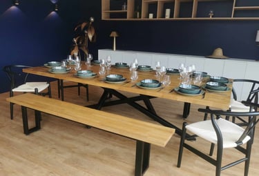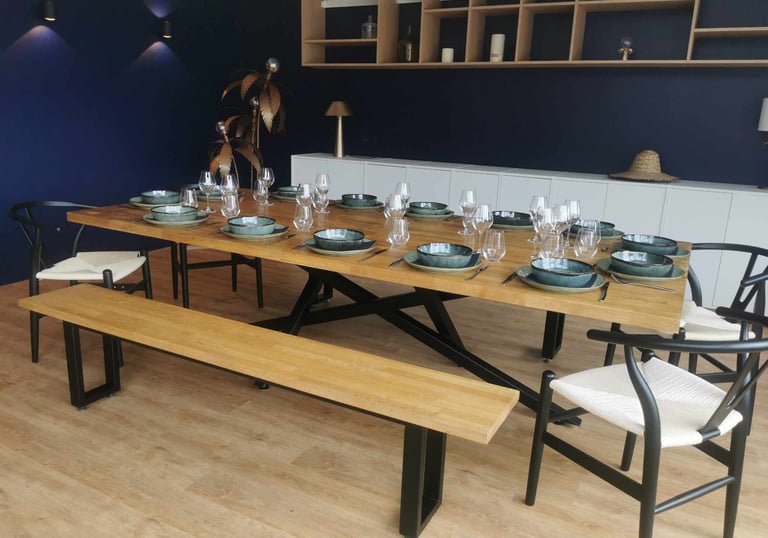 Fabrication sur mesure : escaliers, garde-corps/rampes (selon projet) et mobilier métallique type tables, piètements, étagères ou supports. Nous nous adaptons à vos besoins.